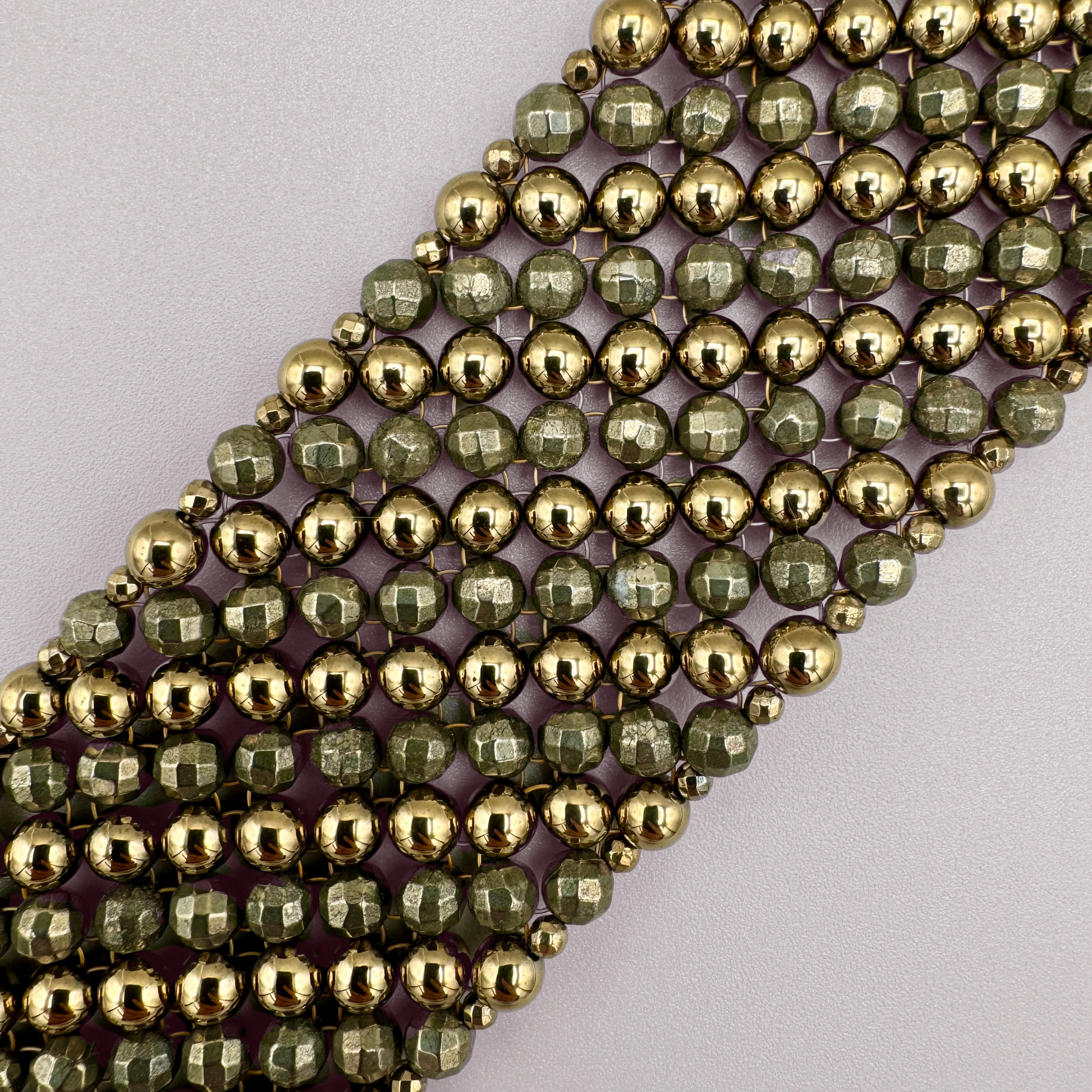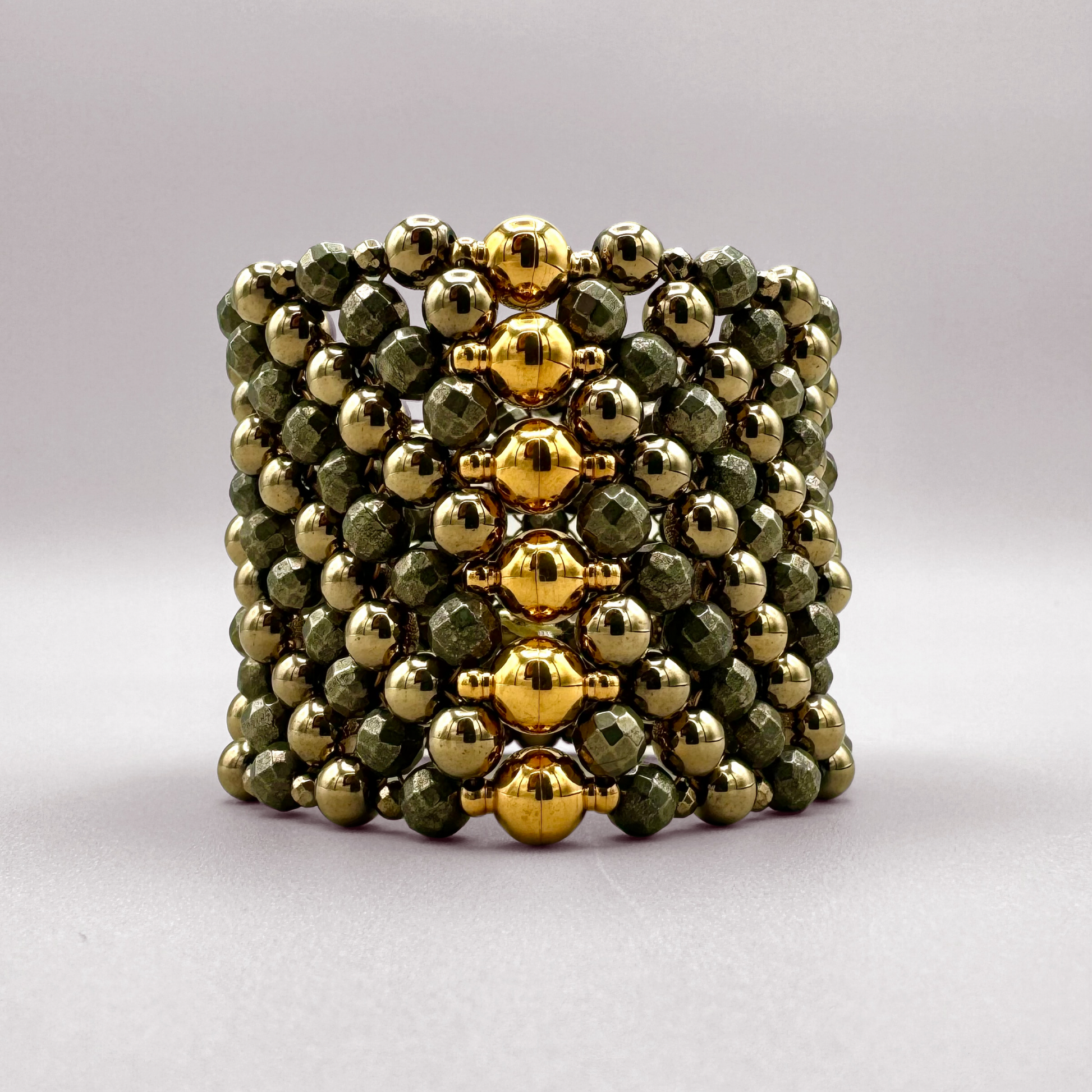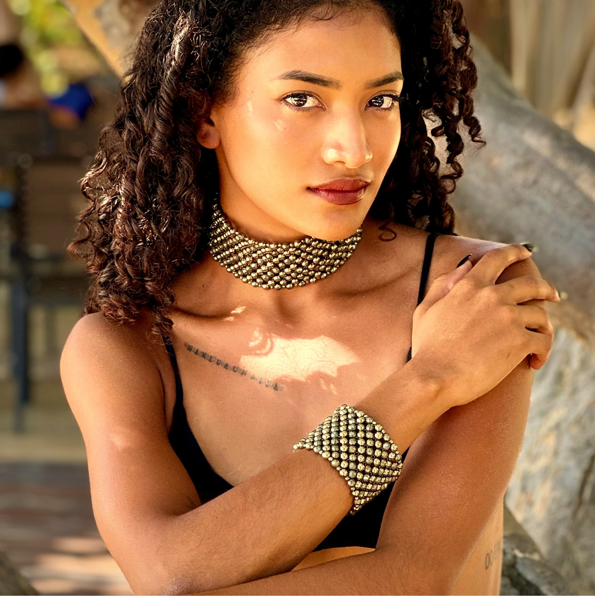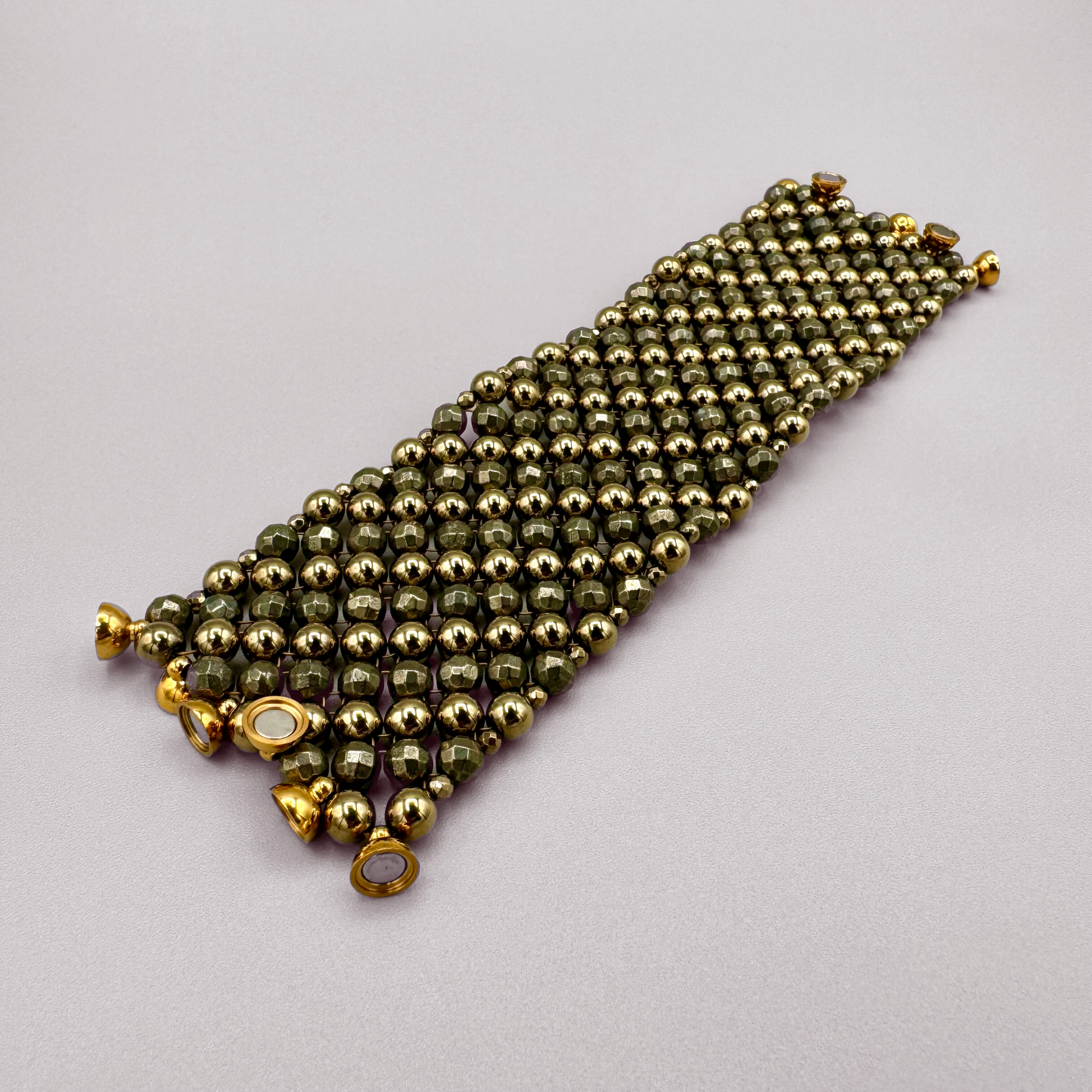 Style notes: the medium-width model of the SAHARA Bracelet collection; neither too slim, nor too chunky, just perfectly balanced. For those who want to make a moderate statement. Thanks to the row of strong jewelry magnets, this piece can be put on single-handedly. Just let the magnets leap together and the Bracelet is secured. Style it with the matching SAHARA Choker Necklace in Pyrite + Gold.