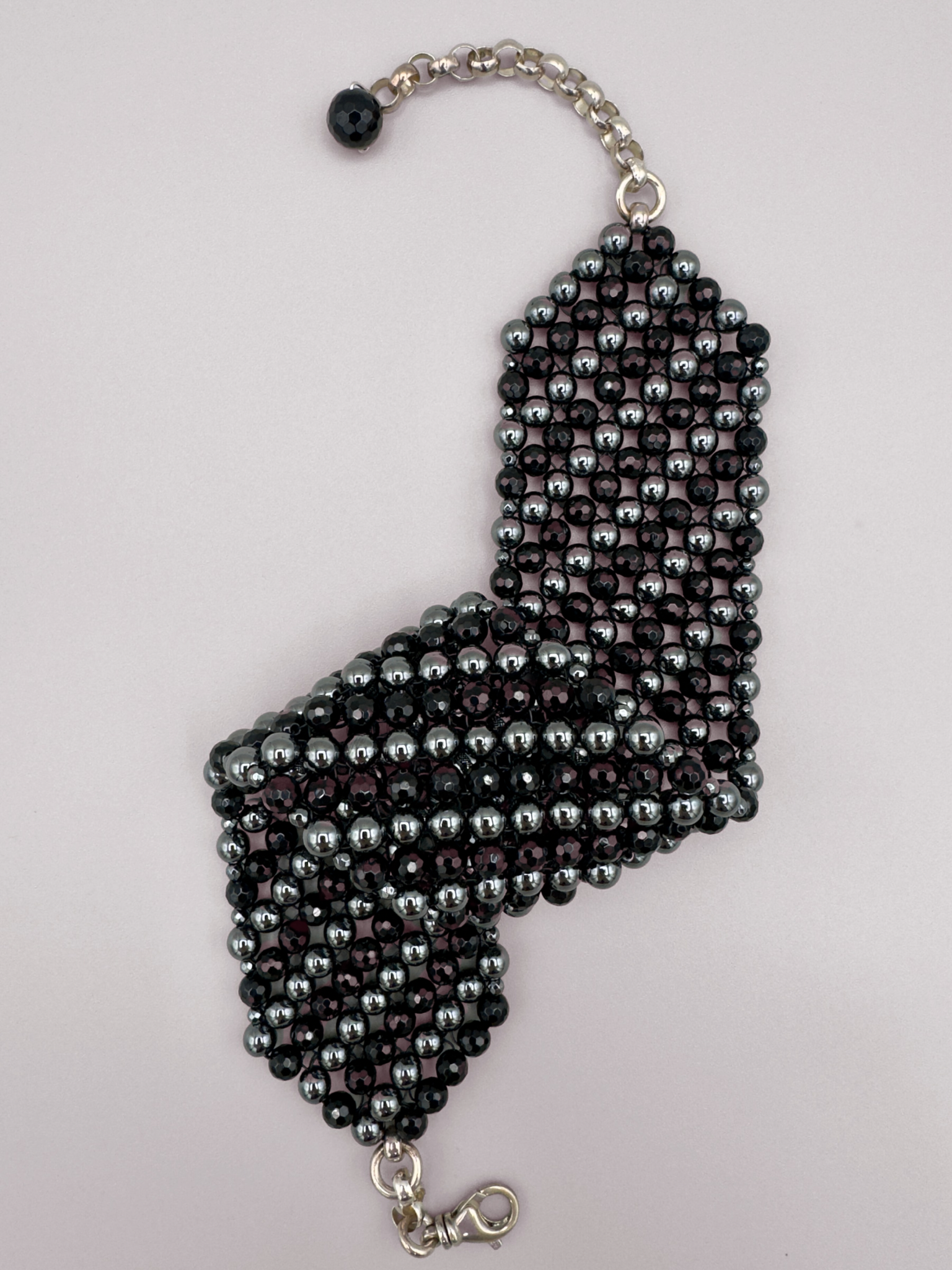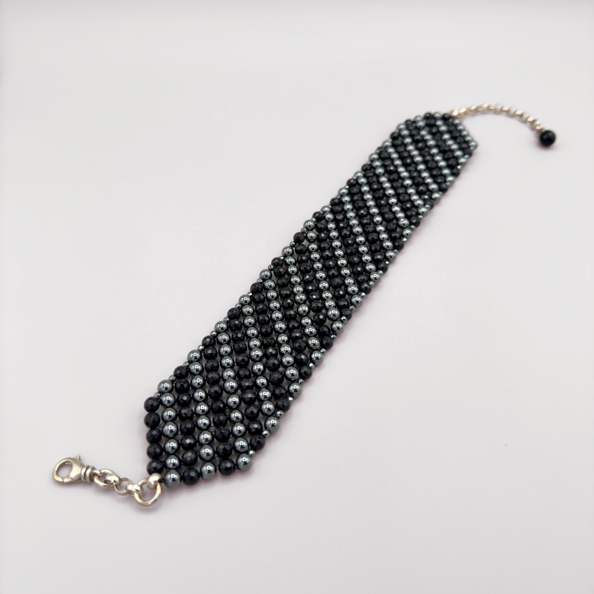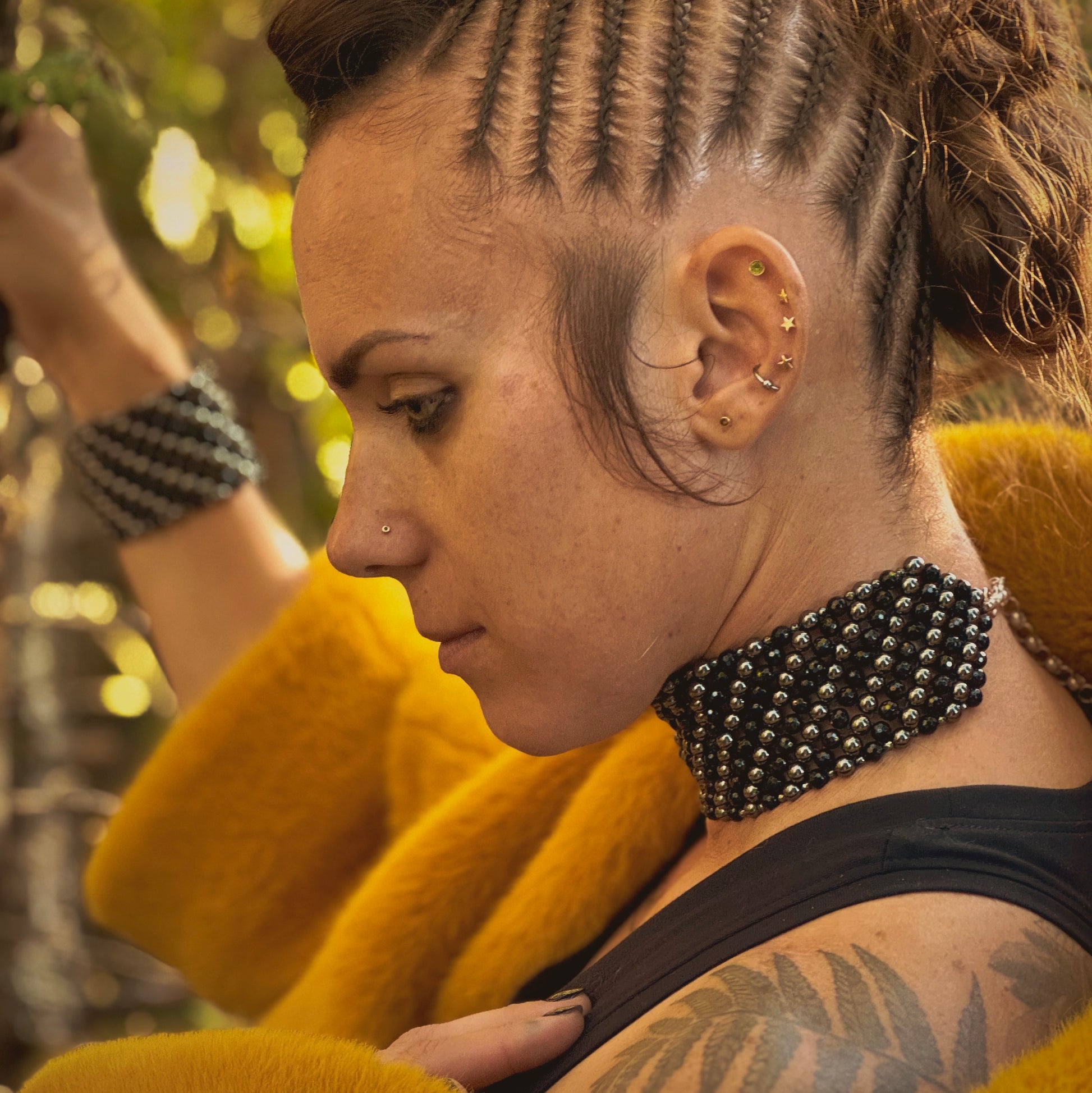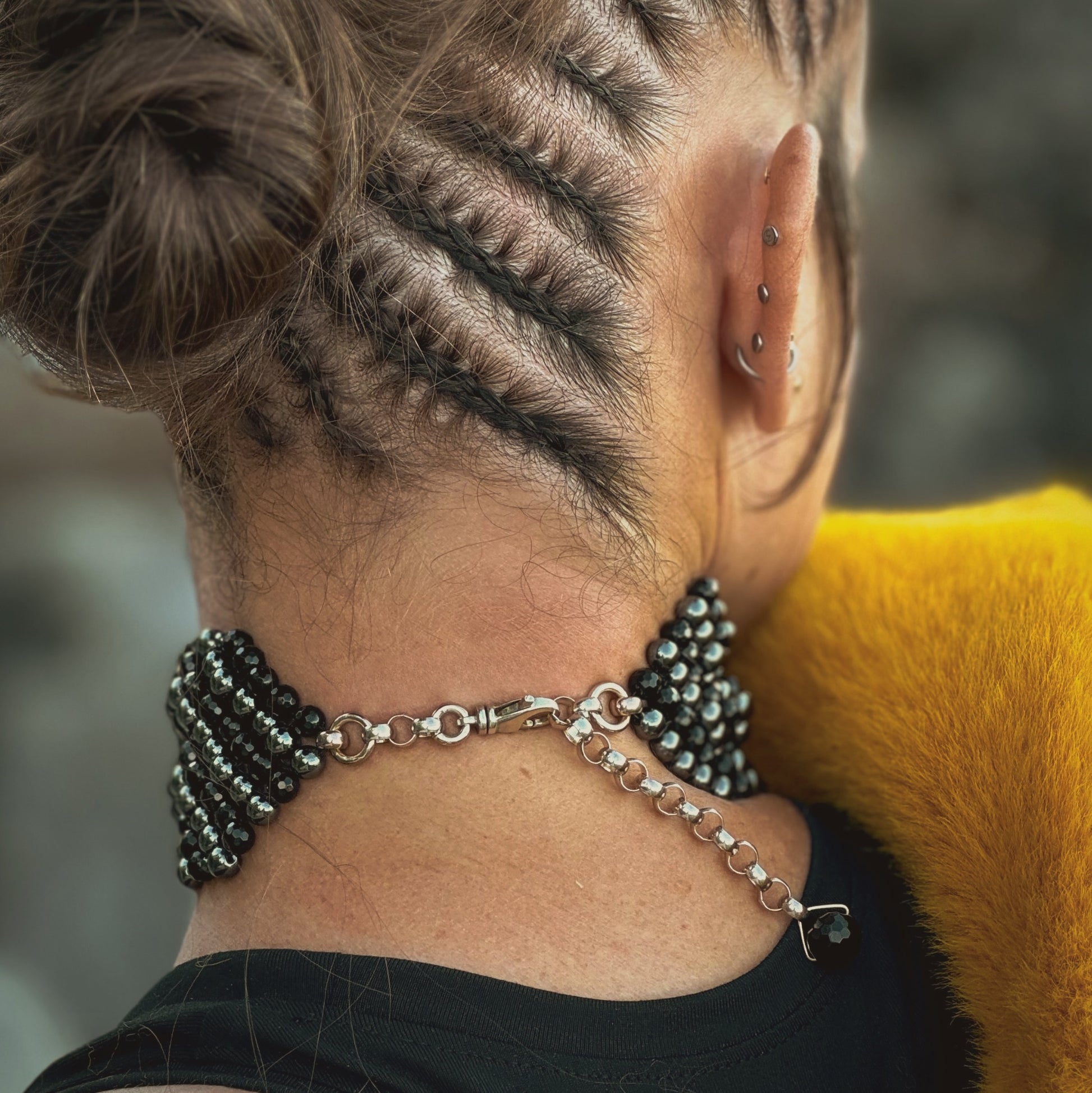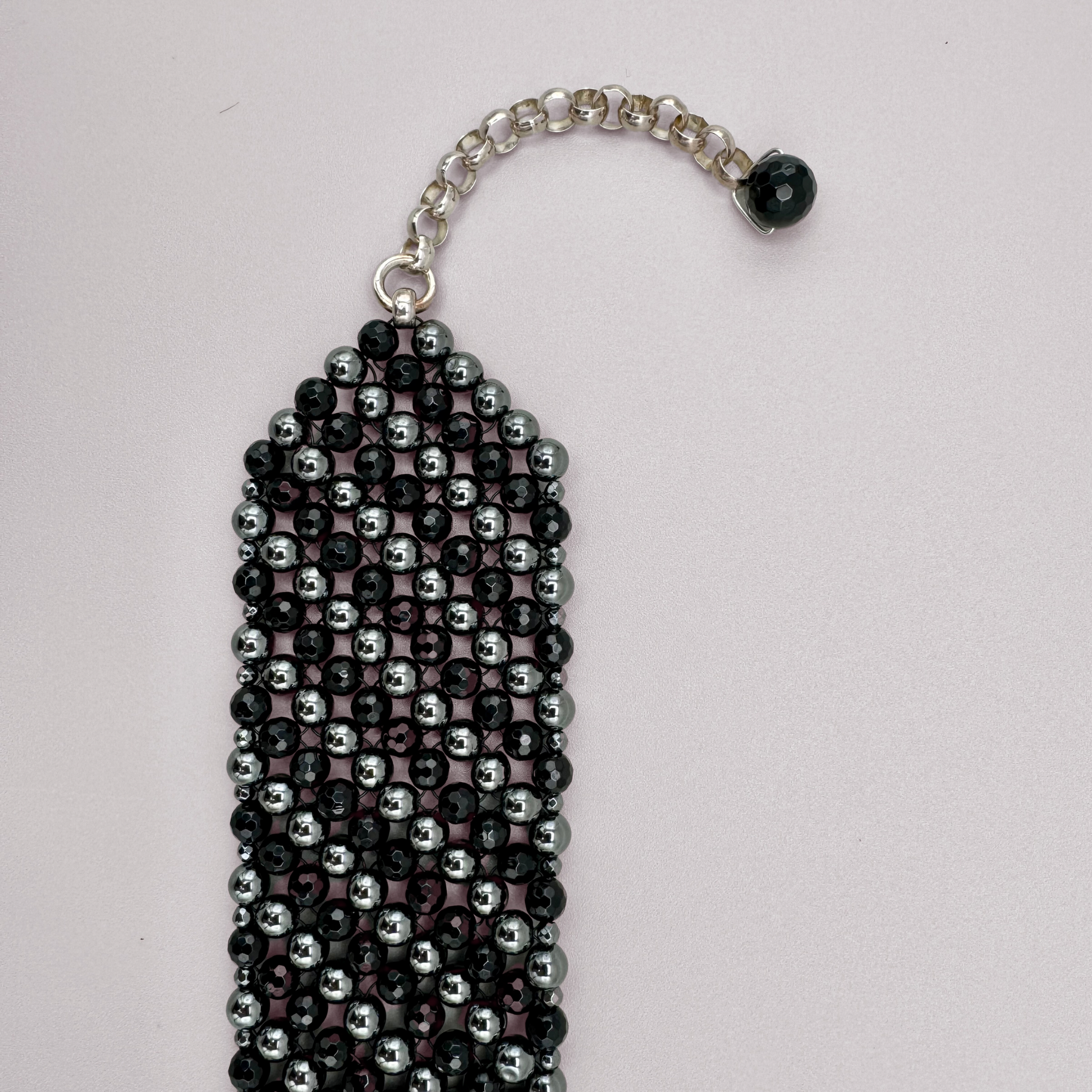 Style notes: a remarkably wide model of the SAHARA Choker Necklace collection; a standout accessory that generously covers a significant portion of the neck. Adjust it to the length you desire, however, it was designed to be a tight fit. Style it with the matching SAHARA Bracelet in Black Onyx + Hematite.