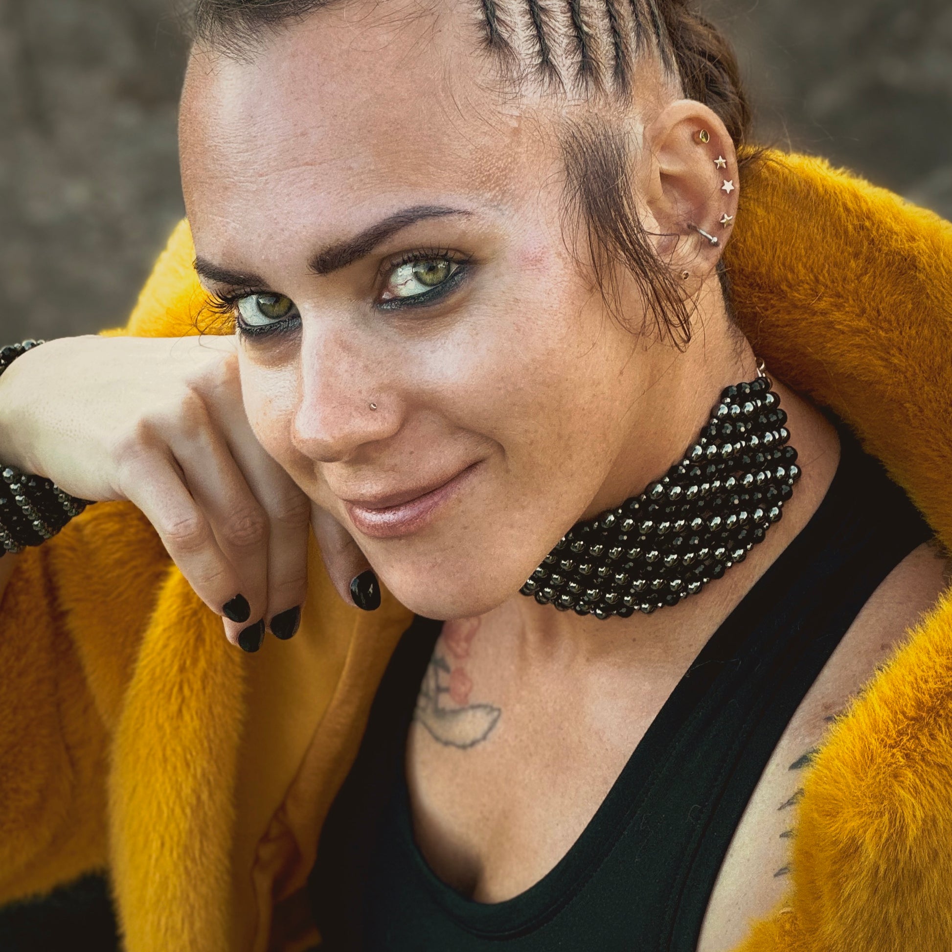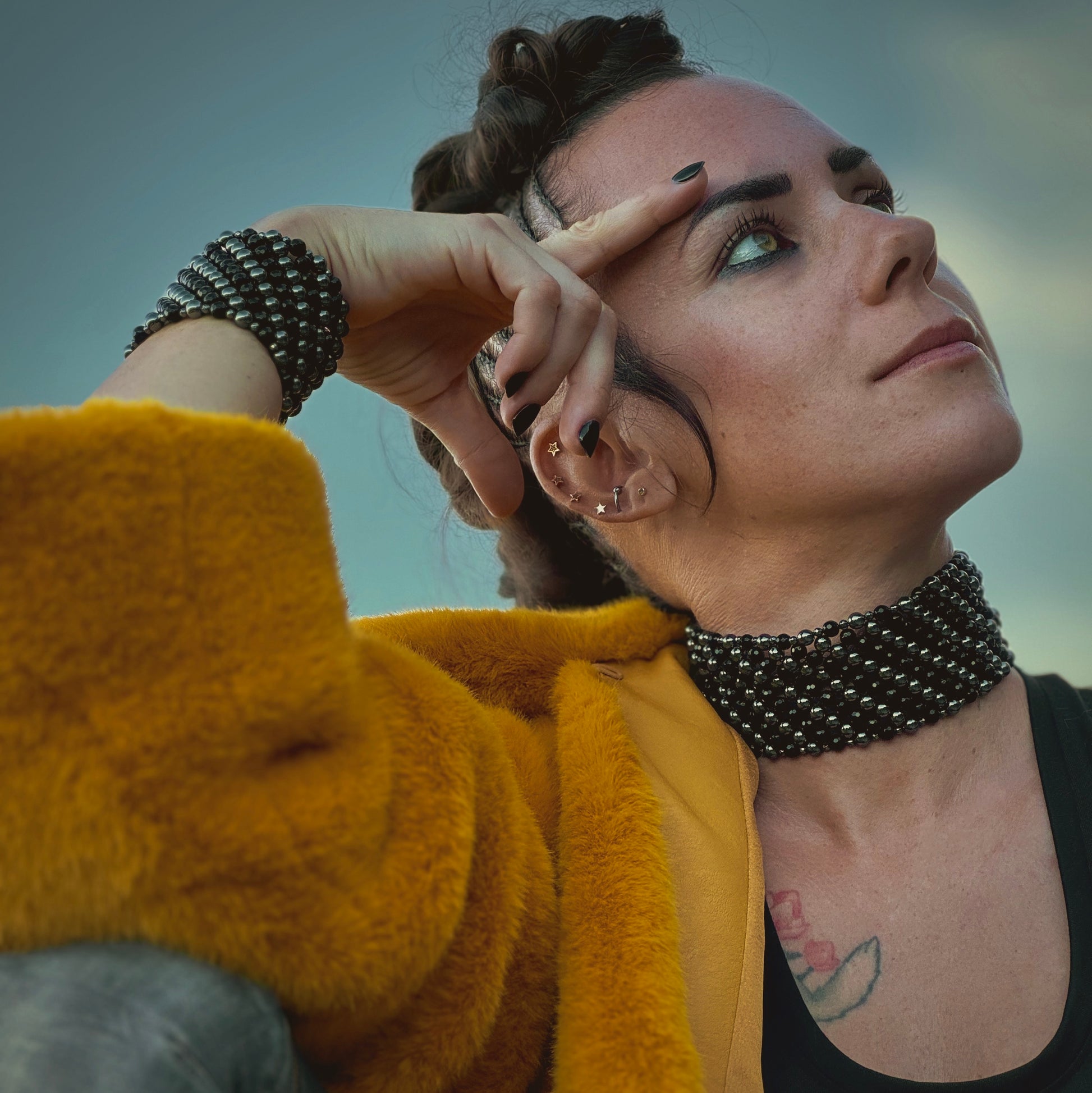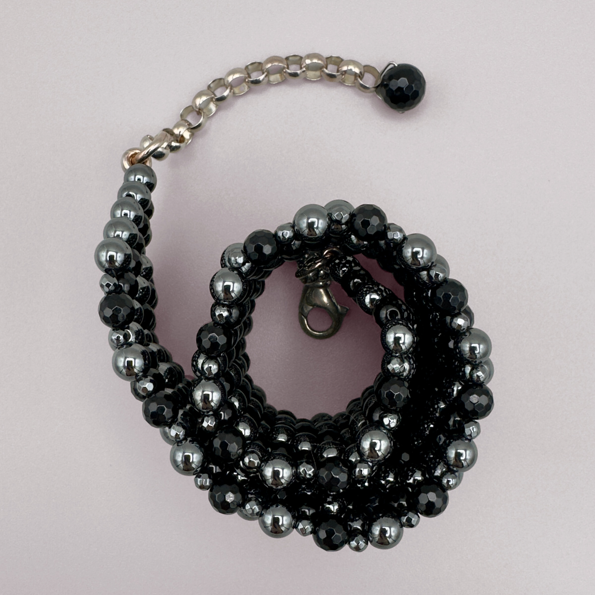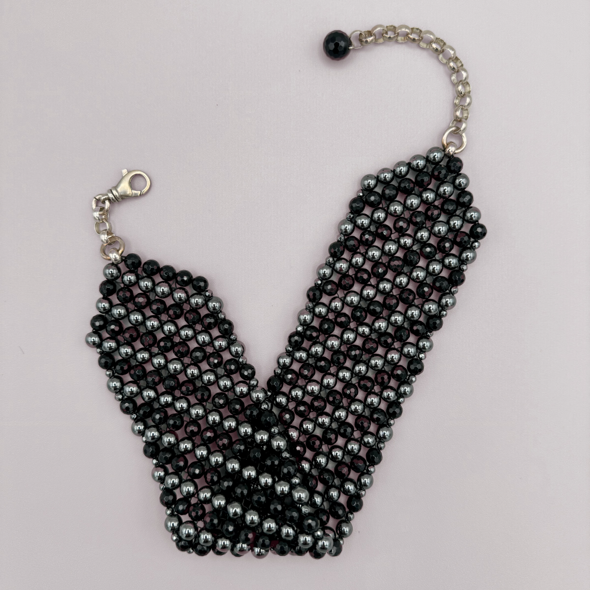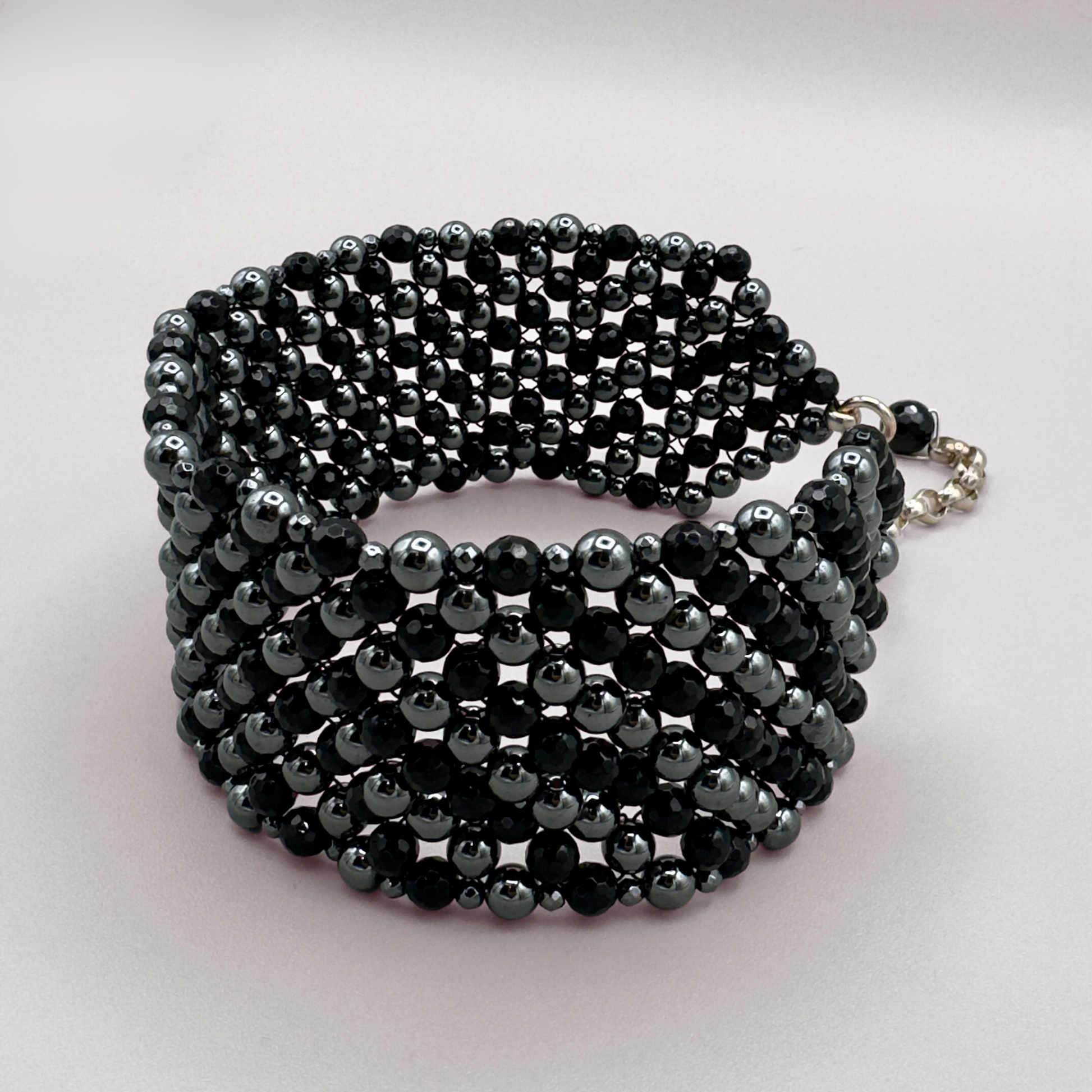 Style notes: a remarkably wide model of the SAHARA Choker Necklace collection; a standout accessory that generously covers a significant portion of the neck. Adjust it to the length you desire, however, it was designed to be a tight fit. Style it with the matching SAHARA Bracelet in Black Onyx + Hematite.