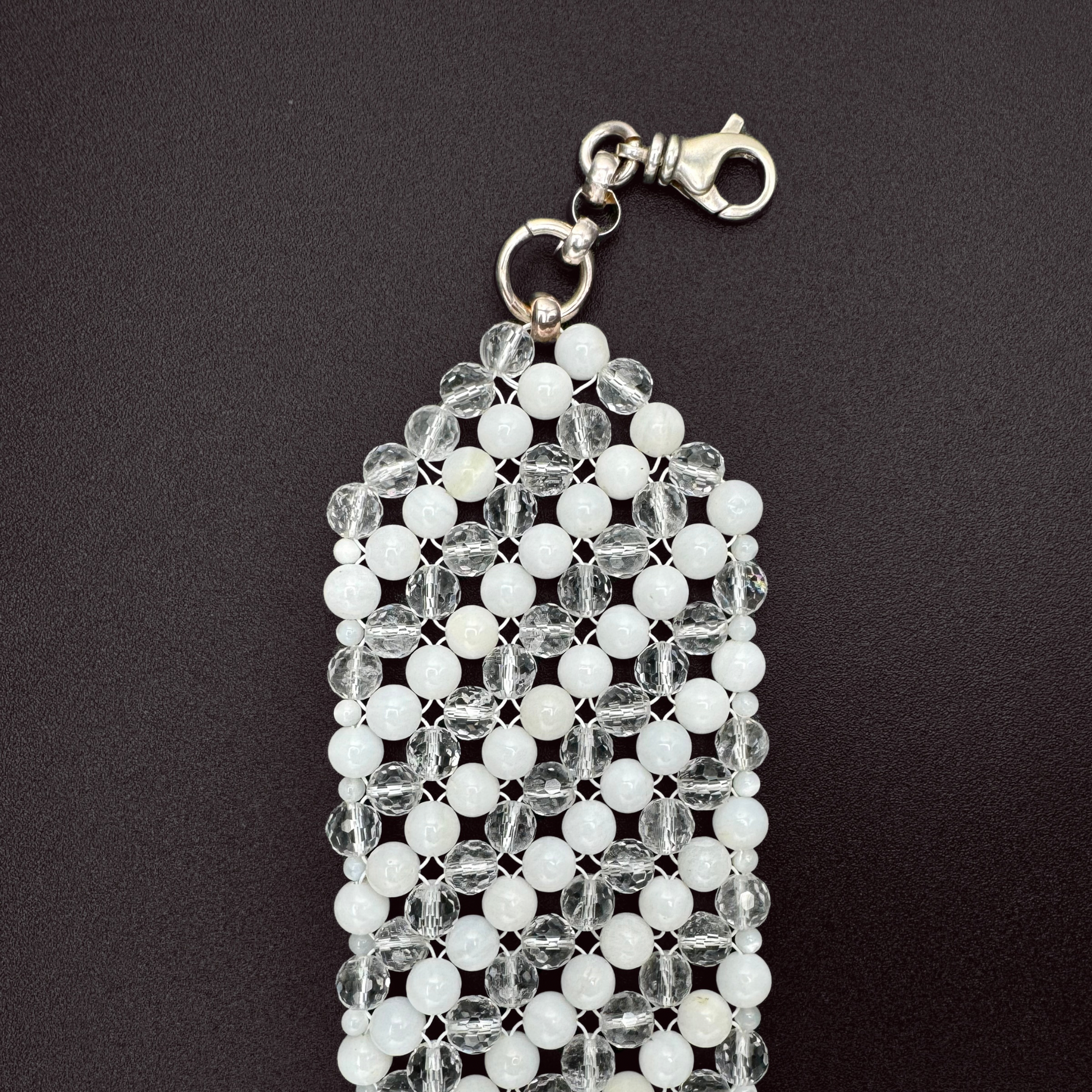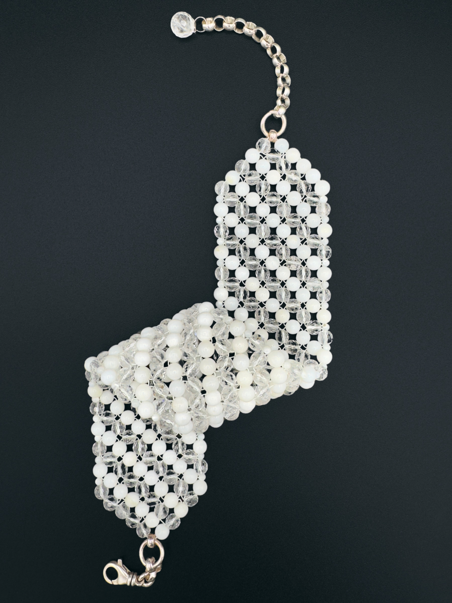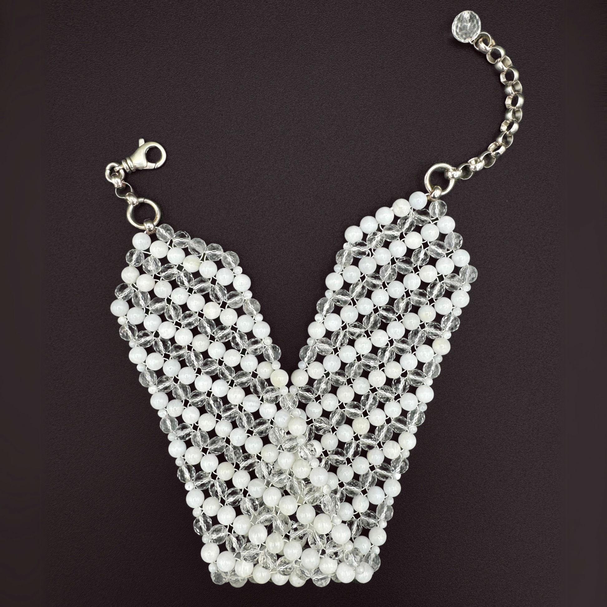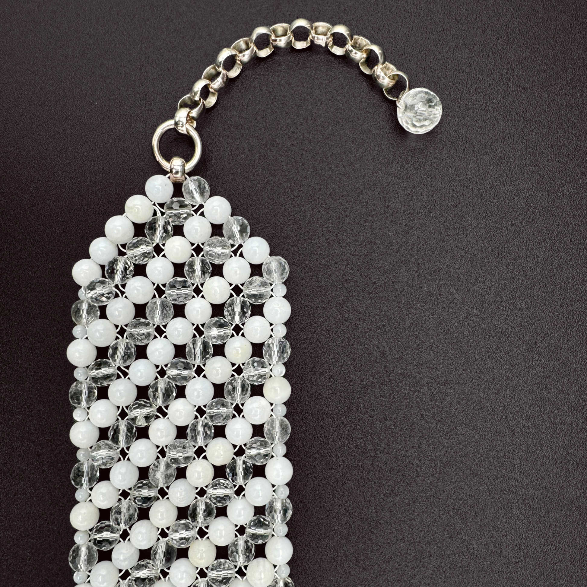 Style Notes: a remarkably wide model of the SAHARA Choker Necklace collection; a standout accessory that generously covers a significant portion of the neck. Adjust it to the length you desire, however, it was designed to be a tight fit. Style it with the matching SAHARA Bracelet in White Shell + Clear Quartz.