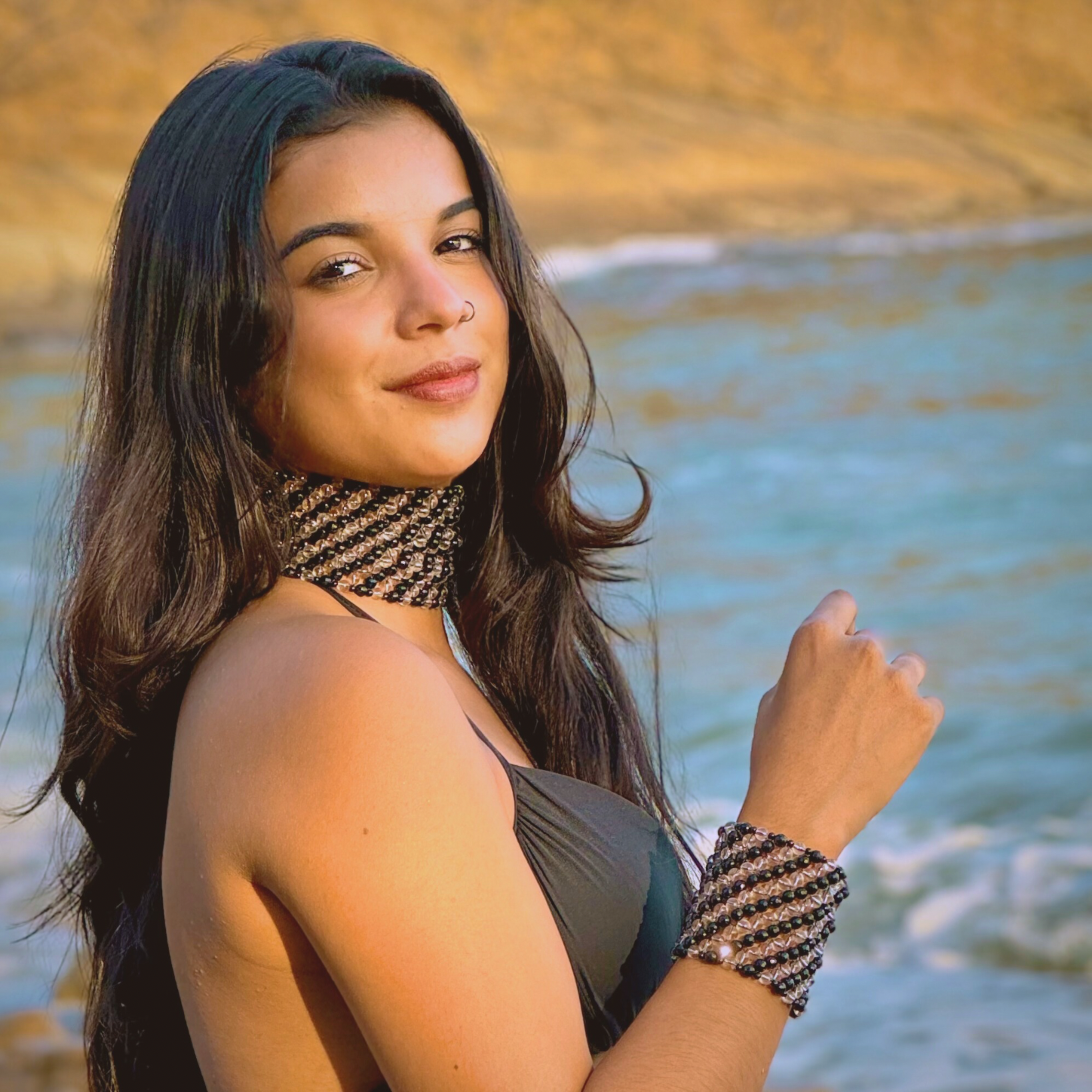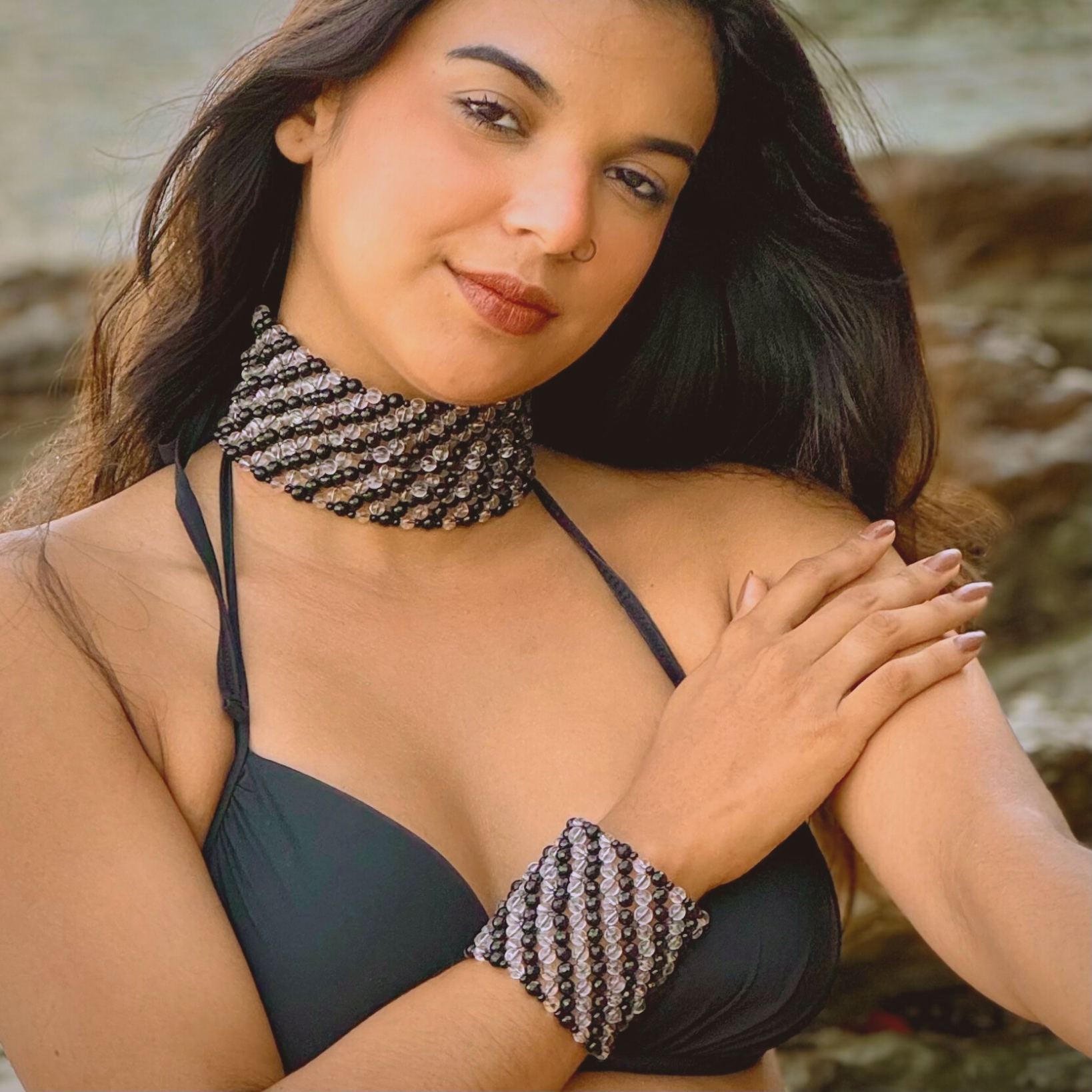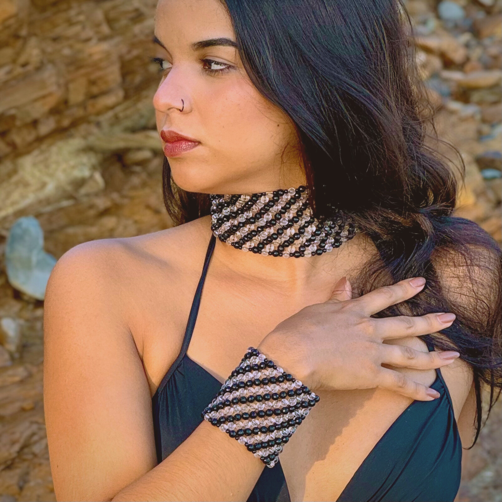Style notes: this oversized model of the SAHARA Bracelet collection is an absolute showstopper, boasting a chunky and eye-catching appearance. Thanks to the row of strong jewelry magnets, this piece can be put on single-handedly. Just let the magnets leap together and the Bracelet is secured. Style it with the matching SAHARA Choker Necklace in Black Onyx + Clear Quartz.
