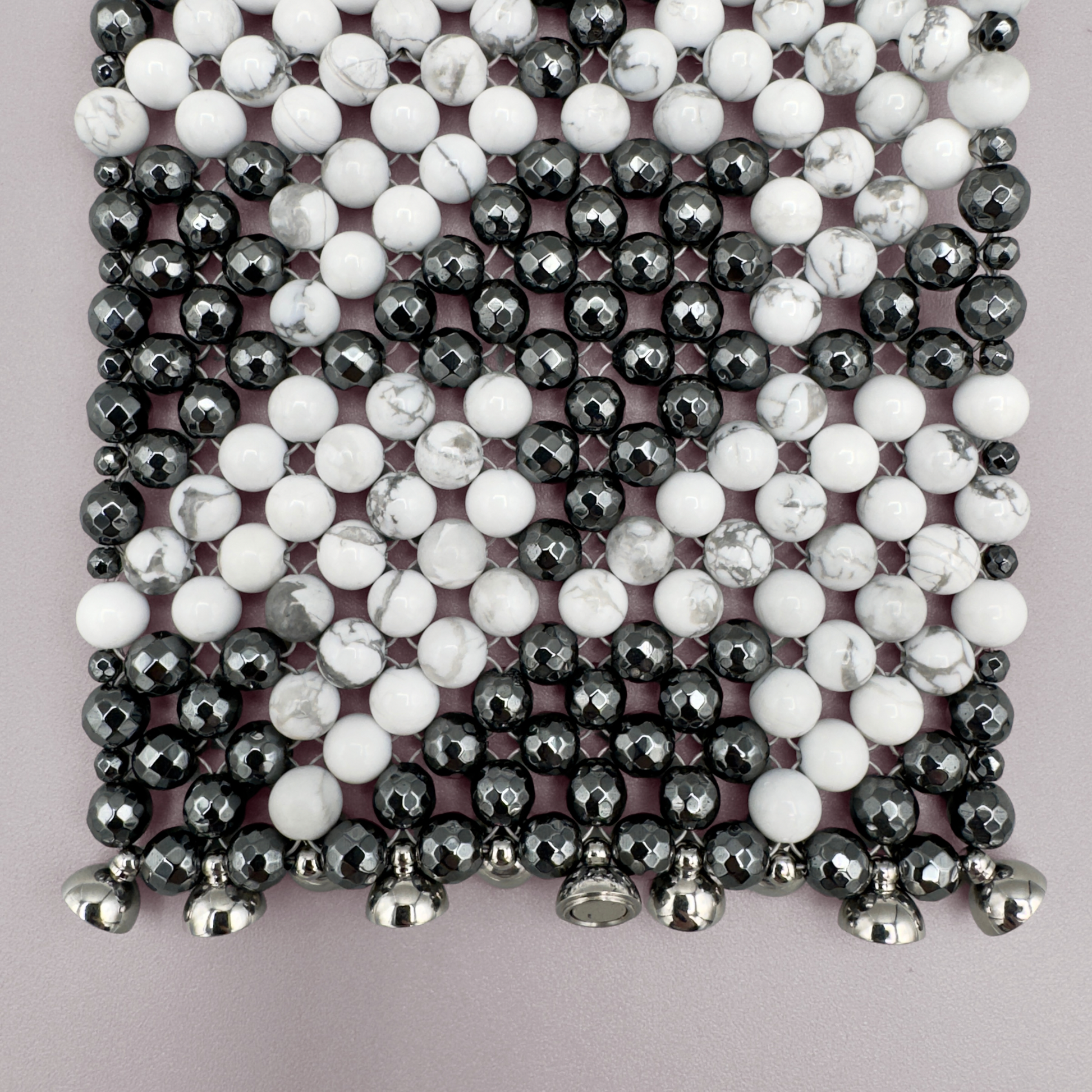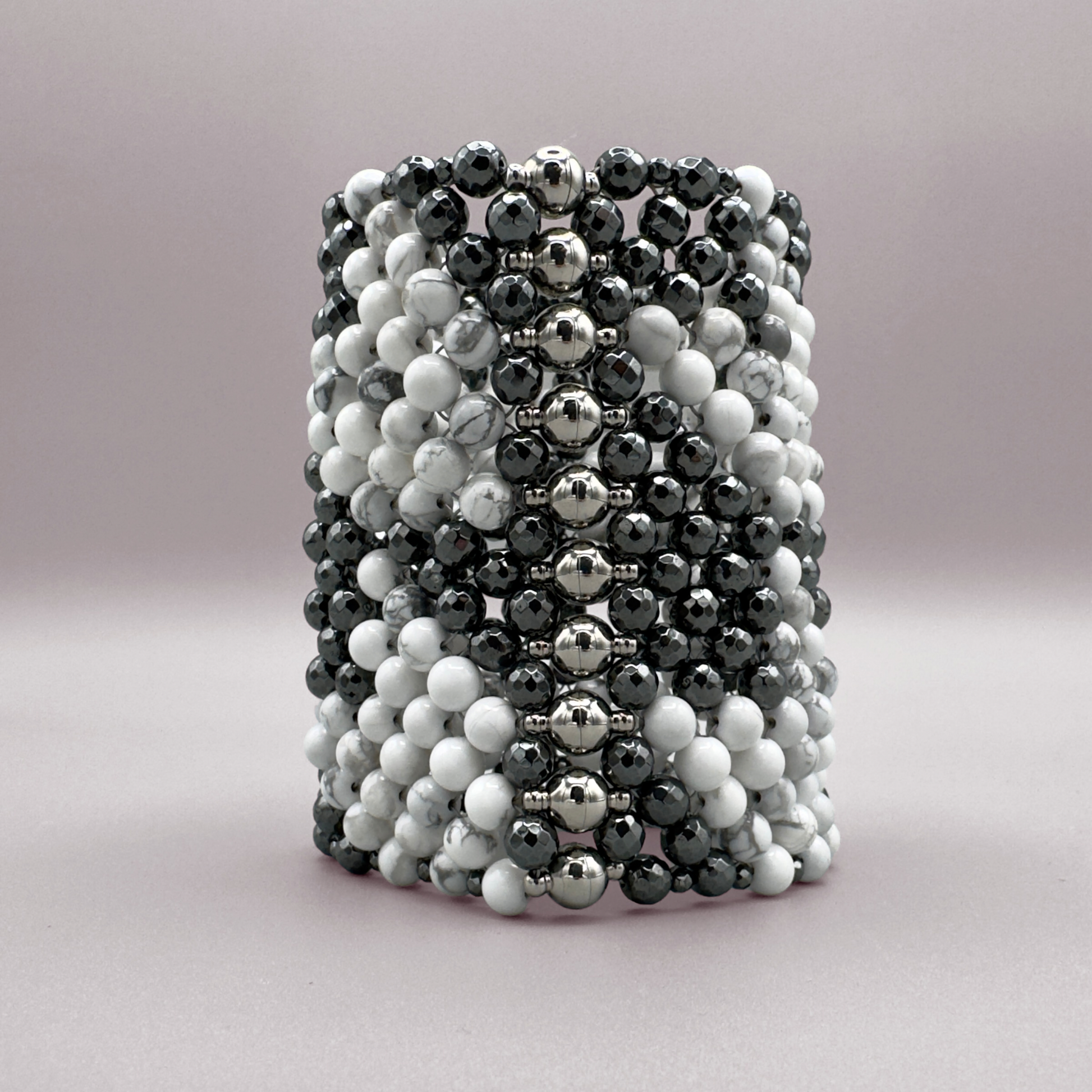 Style notes: the boldest and widest model of the SAHARA Bracelet collection, showcasing the Modern Houndstooth pattern. Thanks to the row of strong jewelry magnets, this piece can be put on single-handedly. Just let the magnets leap together and the Bracelet is secured. Style it with the matching SAHARA Modern Houndstooth Choker Necklace in Howlite + Hematite.