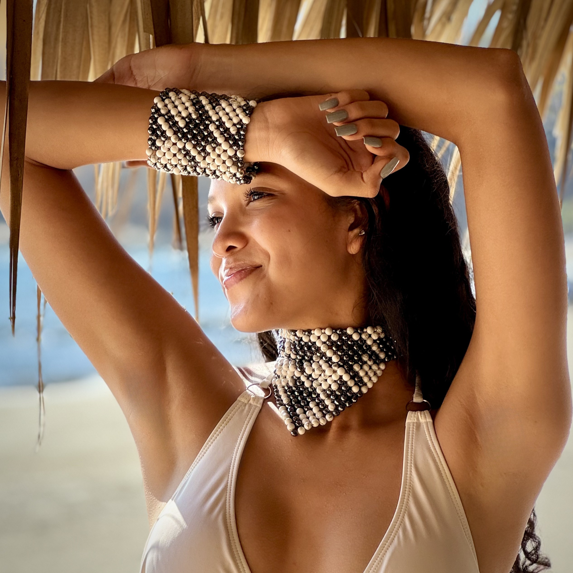 Style notes: the boldest and widest model of the SAHARA Bracelet collection, showcasing the Classic Houndstooth pattern. Thanks to the row of strong jewelry magnets, this piece can be put on single-handedly. Just let the magnets leap together and the Bracelet is secured. Style it with the matching SAHARA Classic Houndstooth Choker Necklace in Howlite + Hematite.
