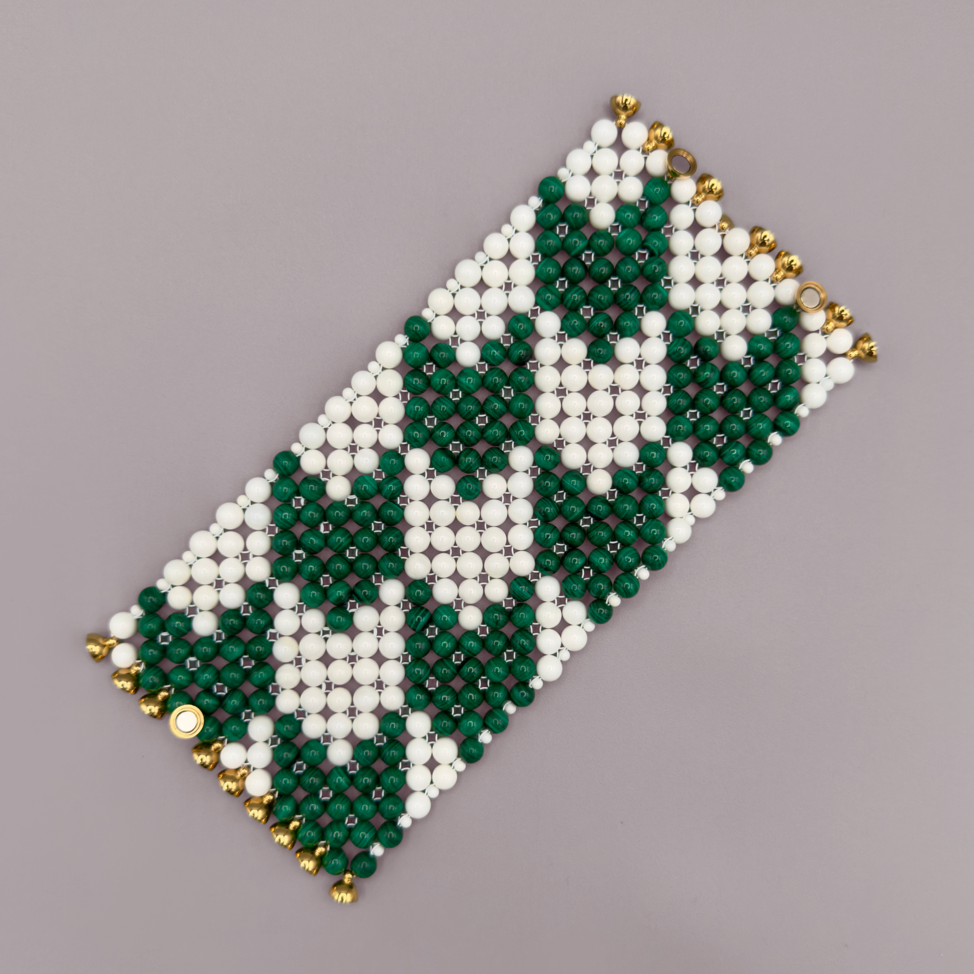 Style notes: the boldest and widest model of the SAHARA Bracelet collection, showcasing the modern Houndstooth pattern. Thanks to the row of strong jewelry magnets, this piece can be put on single-handedly. Just let the magnets leap together and the Bracelet is secured. Style it with the matching SAHARA modern Houndstooth Necklace in Malachite + White Shell.