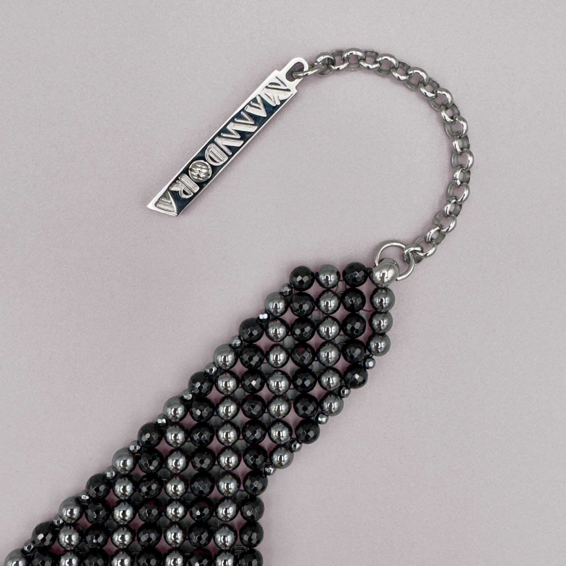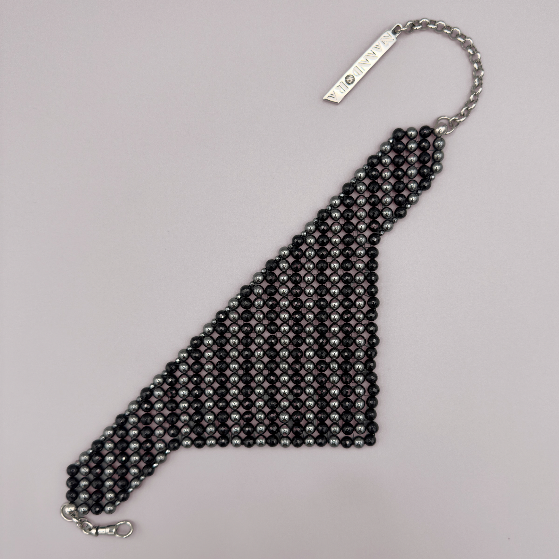 Style notes: the SAHARA S12 Choker Necklace is a daring reinterpretation of the classic Choker Necklace. The geometrically minimalist design features a triangular drop that elegantly descends from the choker band. Adjust it to the length you desire, however it fits best if sitting high and hugging the neck tightly. Style it with the matching SAHARA Bracelet in Black Onyx + Hematite.