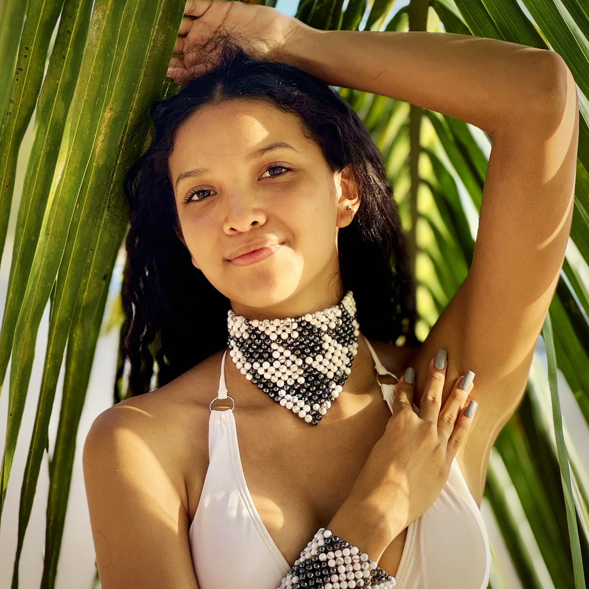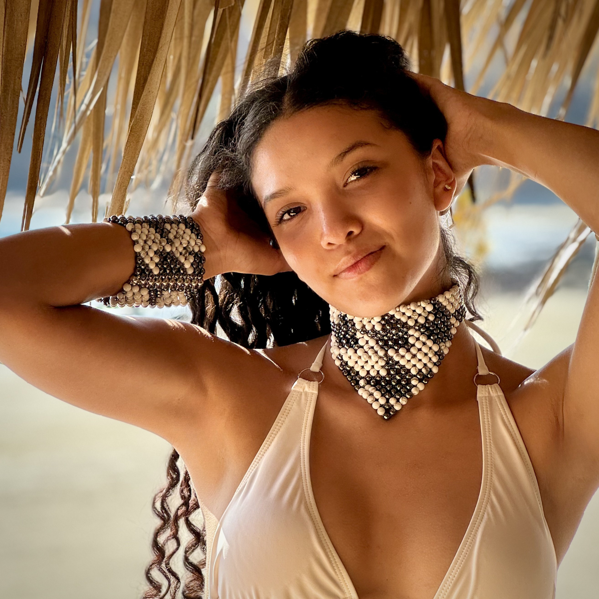 Style notes: the SAHARA S12 Choker Necklace is a daring reinterpretation of the classic Choker Necklace. The geometrical design features a triangular drop that elegantly descends from the choker band, showcasing the Modern Houndstooth pattern. Adjust it to the length you desire, however it fits best if sitting high and hugging the neck tightly. Style it with the matching SAHARA S10 Modern Houndstooth Bracelet in Howlite + Hematite.