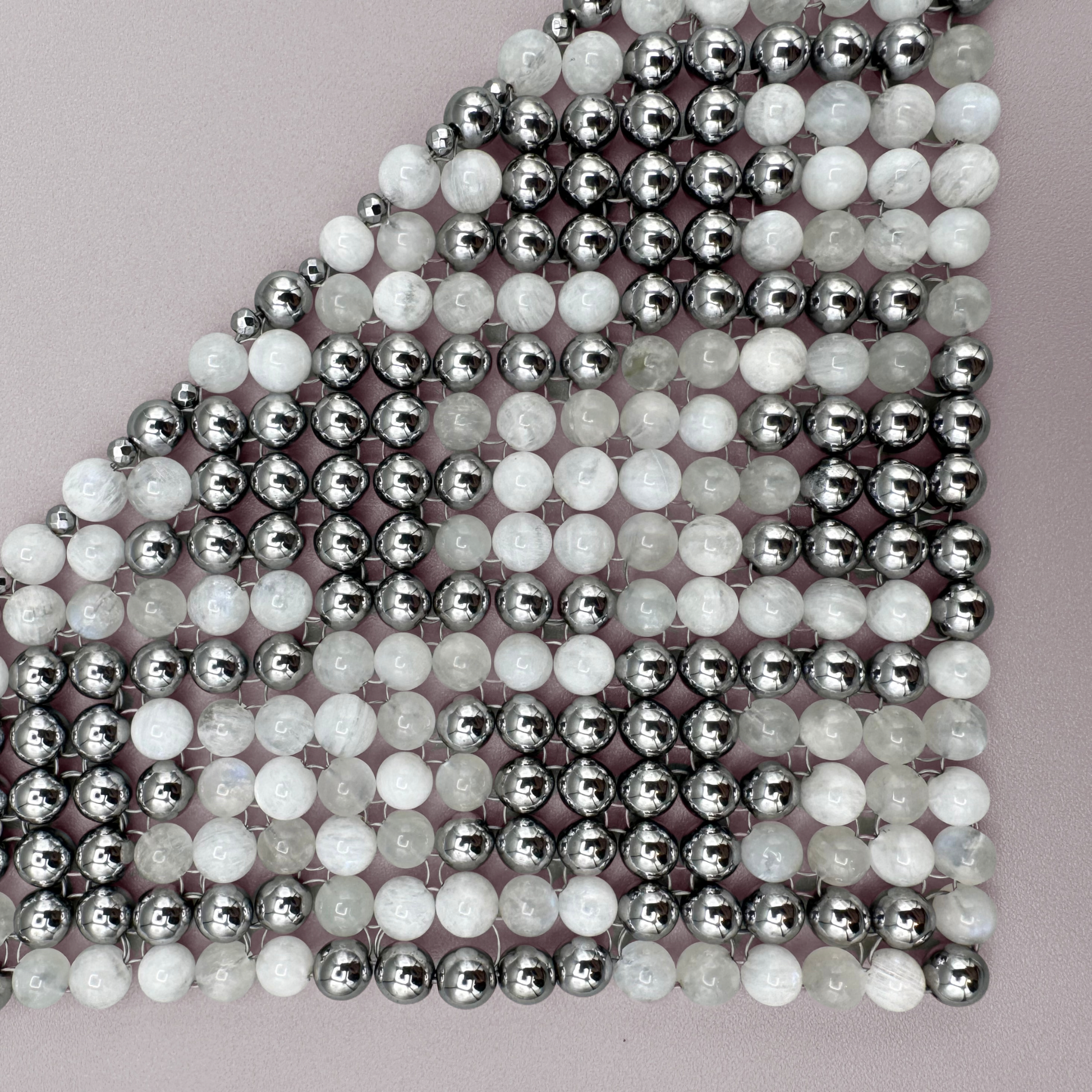 - Genuine White Moonstone + Synthetic Silver Hematite Crystals