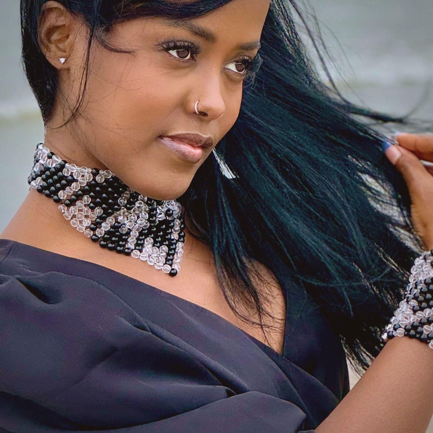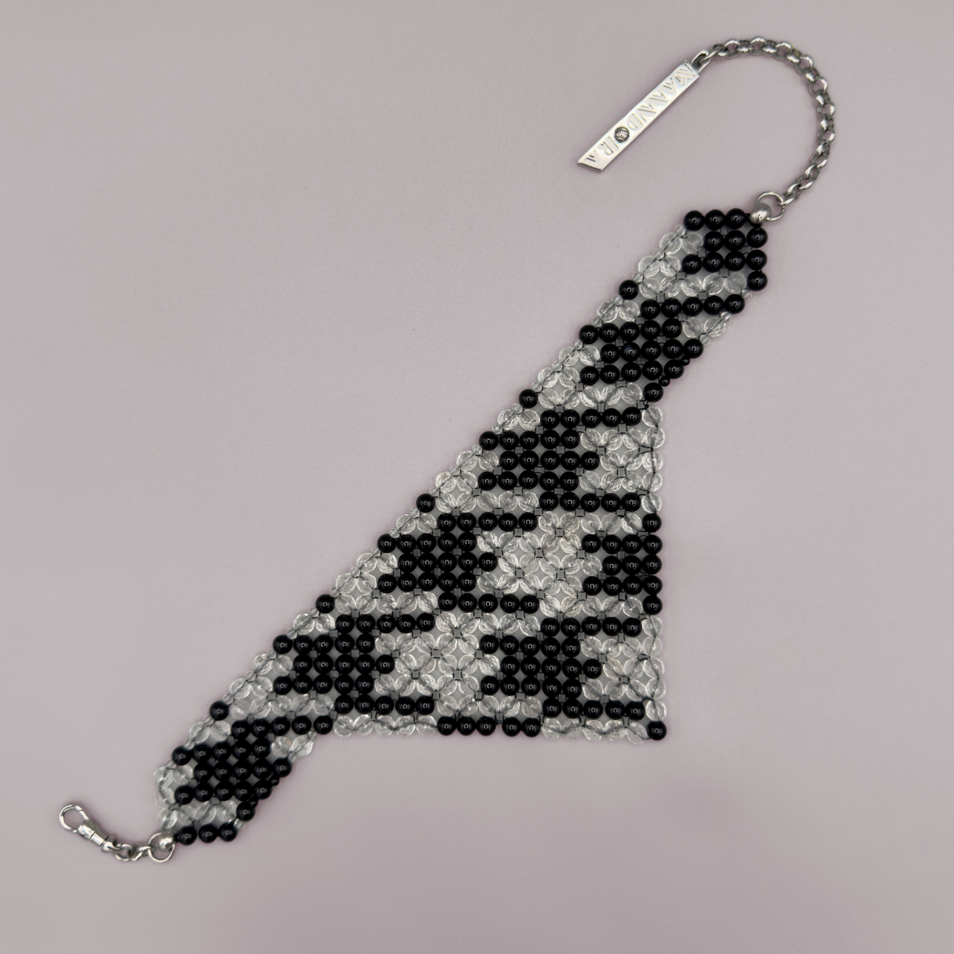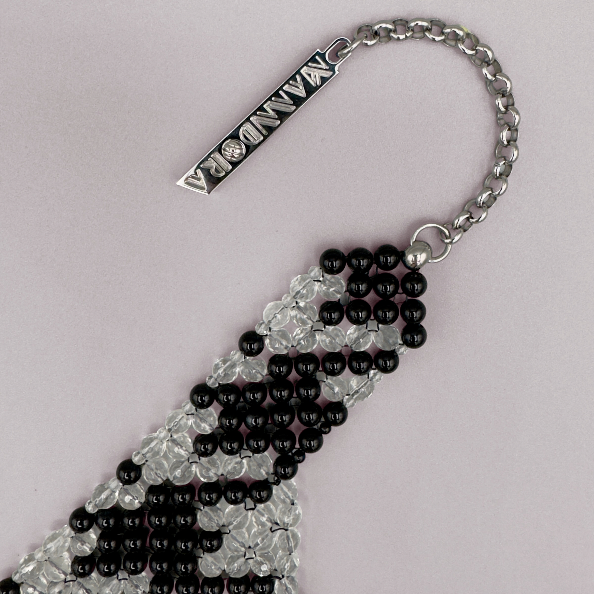 Style notes: the SAHARA S12 Choker Necklace is a daring reinterpretation of the classic Choker Necklace. The geometrical design features a triangular drop that elegantly descends from the choker band, showcasing the classic Houndstooth pattern. Adjust it to the length you desire, however it fits best if sitting high and hugging the neck tightly. Style it with the matching SAHARA S10 Houndstooth Bracelet in Black Onyx + Clear Quartz.