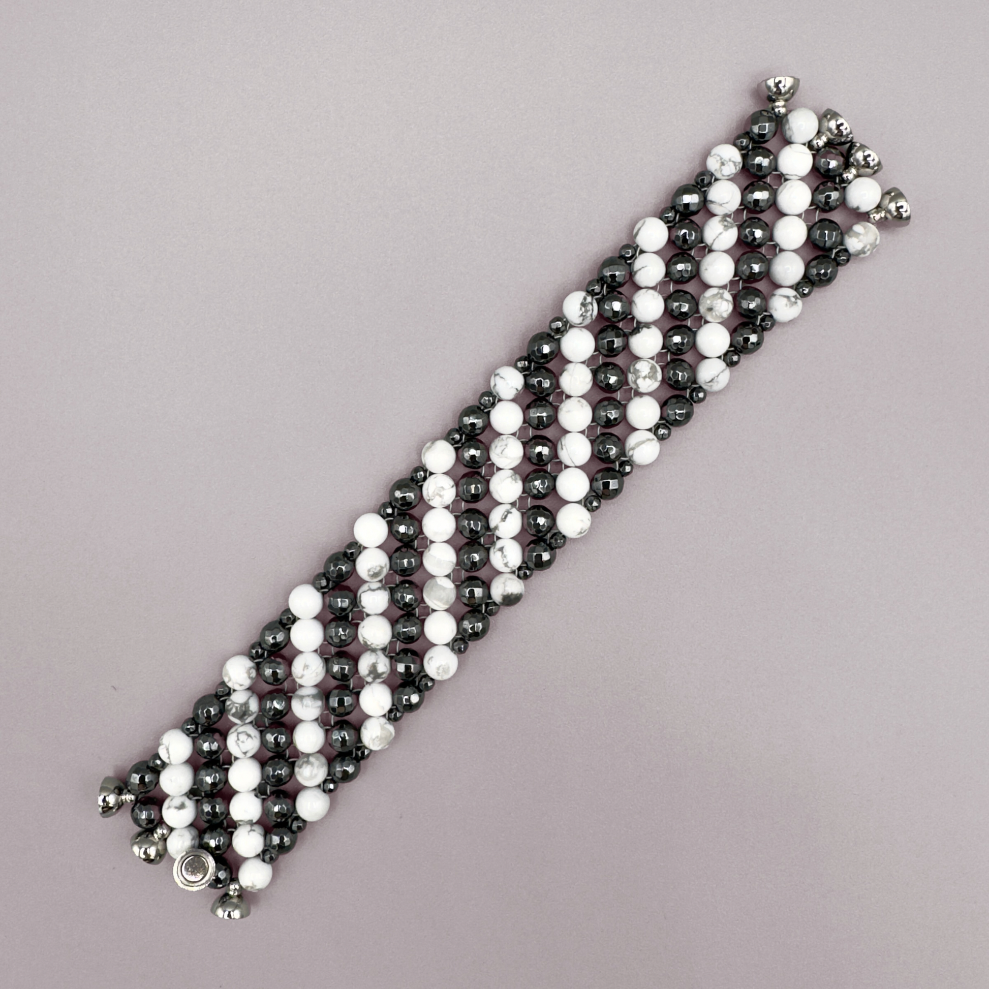 Style notes: this elegantly slim model of the SAHARA Bracelet collection makes a great layering Bracelet, or a tastefully petite piece if worn solo. Thanks to the row of strong jewelry magnets, this piece can be put on single-handedly. Just let the magnets leap together and the Bracelet is secured. Style it with the matching SAHARA Choker Necklace in Howlite + Hematite.