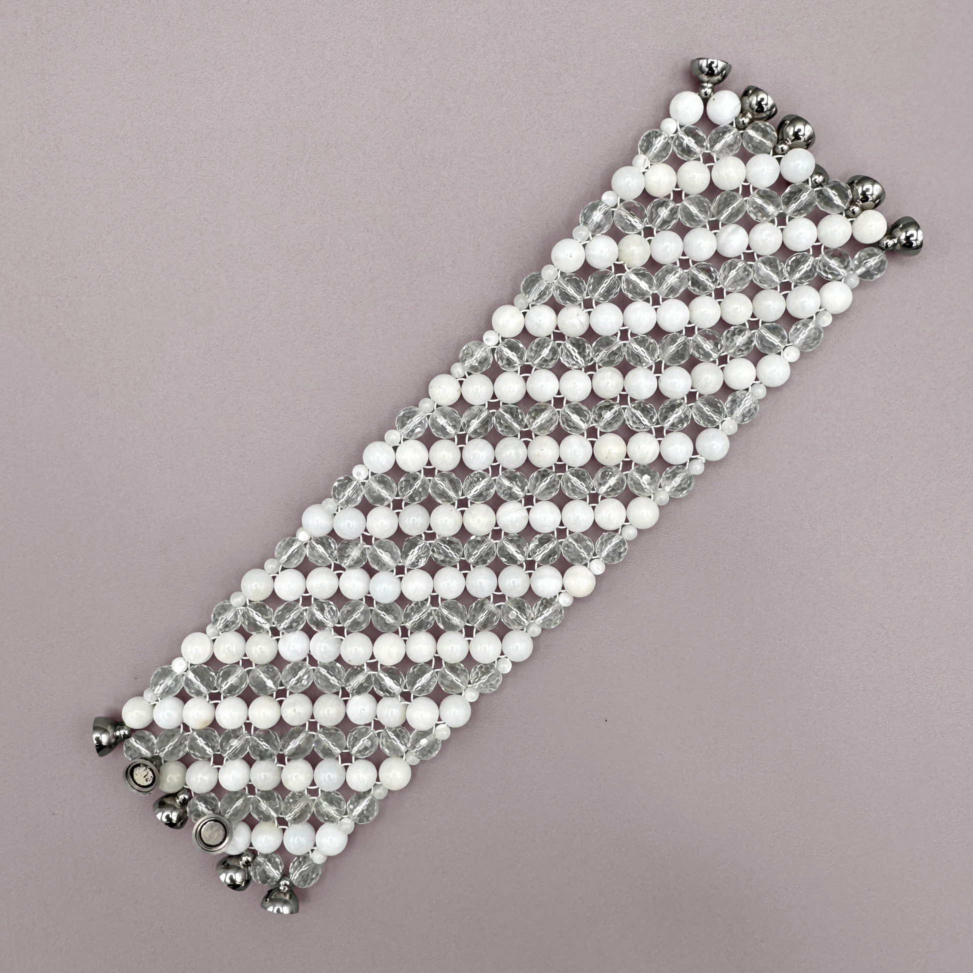 Style notes: the medium-width model of the SAHARA Bracelet collection; neither too slim, nor too chunky, just perfectly balanced. Thanks to the row of strong jewelry magnets, this piece can be put on single-handedly. Just let the magnets leap together and the Bracelet is secured. Style it with the matching SAHARA Choker Necklace in White Shell + Clear Quartz.