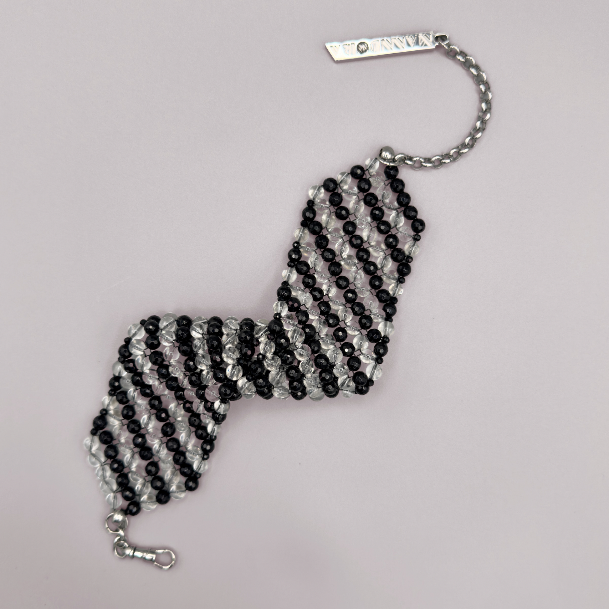 Style notes: a remarkably wide model of the SAHARA Choker Necklace collection; a standout accessory that generously covers a significant portion of the neck. Adjust it to the length you desire, however, it was designed to be a tight fit. Style it with the matching SAHARA Bracelet in Black Onyx + Clear Quartz.