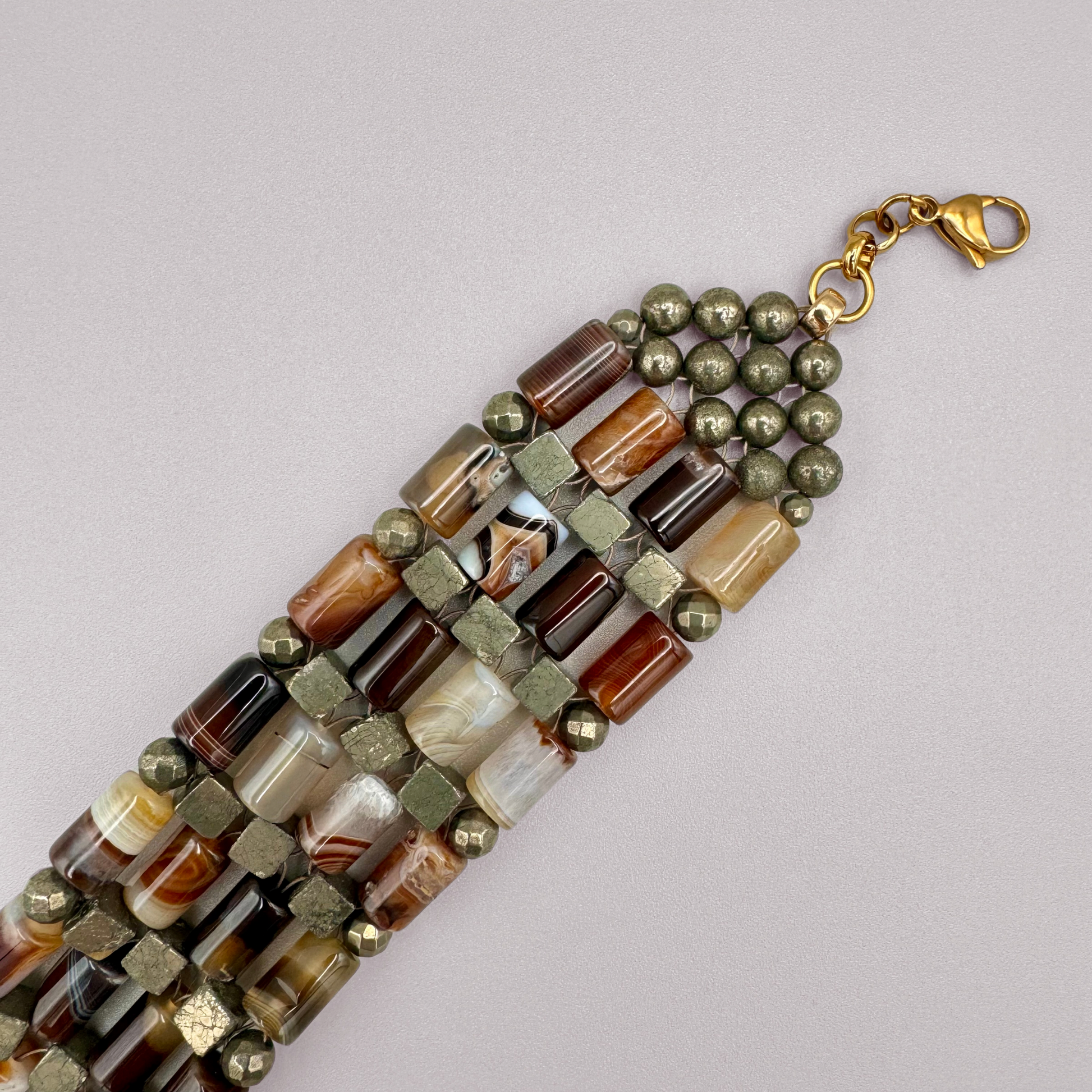 Style notes: make a statement like no other wearing this exclusive rarity. Adjust it to the length you desire, however, it was designed to be a tight fit. Style it with the matching Brown Agate + Pyrite Bangle.